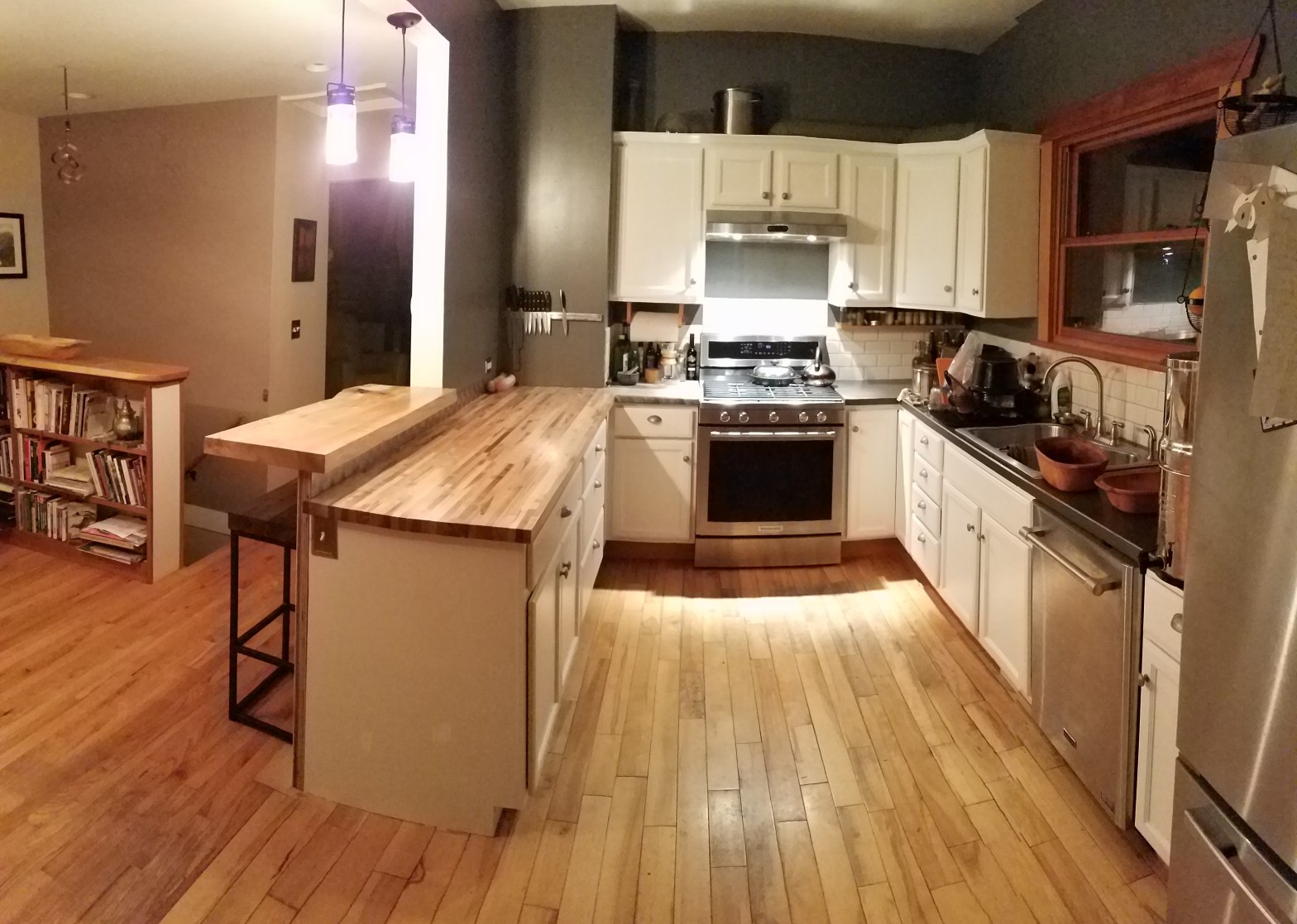 Now that it’s reassembled, the kitchen is glorious. We eat nearly every meal at the maple slab breakfast counter, and the full-size dining room table where we used to eat is slowly being buried by tools and unopened mail, like a normal family.