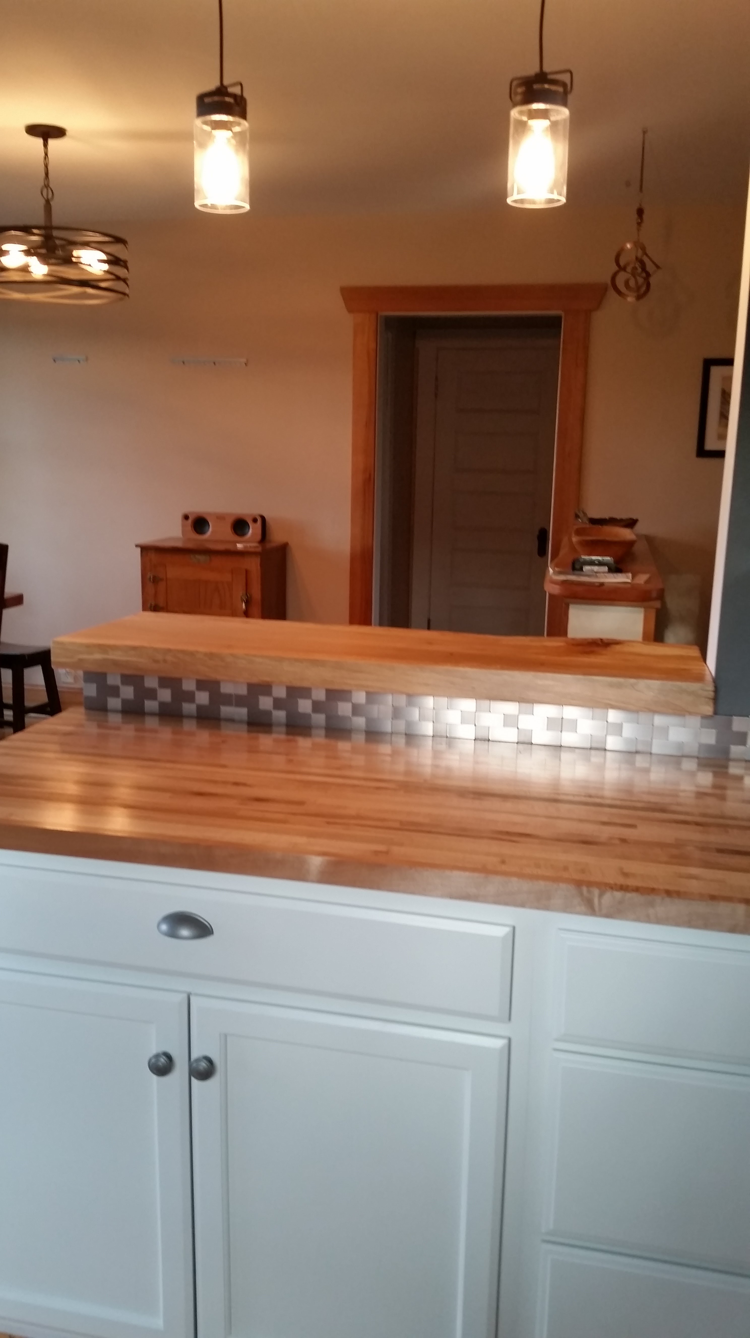 New butcherblock and pendant lights.